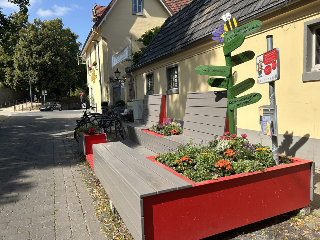 Das Parklet ist besonders bienenfreundlich. Auf dem von Schülerinnen des Archigymnasiums entwickelten und gebauten Wegweiser findet ihr einige bienenrelevanten Orte in Soest.